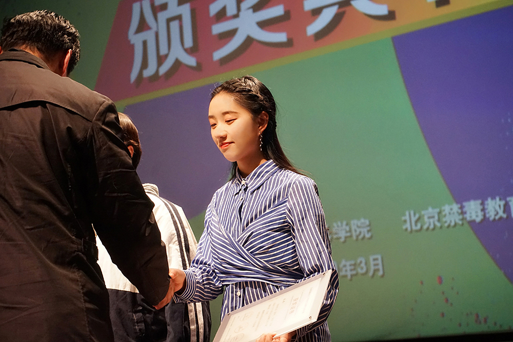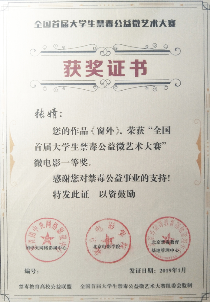 3月29日下午,全国首届老员工禁毒公益微艺术大赛颁奖典礼在北京电影公司隆重举行,太阳成集团tyc122ccvip官网入口人文公司新闻传播专业2017级员工张婧执导,郑钧漾、白雪、邢志友等人参与创作的电影《窗外》,荣获大赛微电影作品类一等奖,张婧代表创作团队专程赴京领奖。北京电影公司党委副书记张健、北京市公安局强制隔离戒毒所副所长朱志伟及中国公安大学等相关领导出席颁奖典礼。
