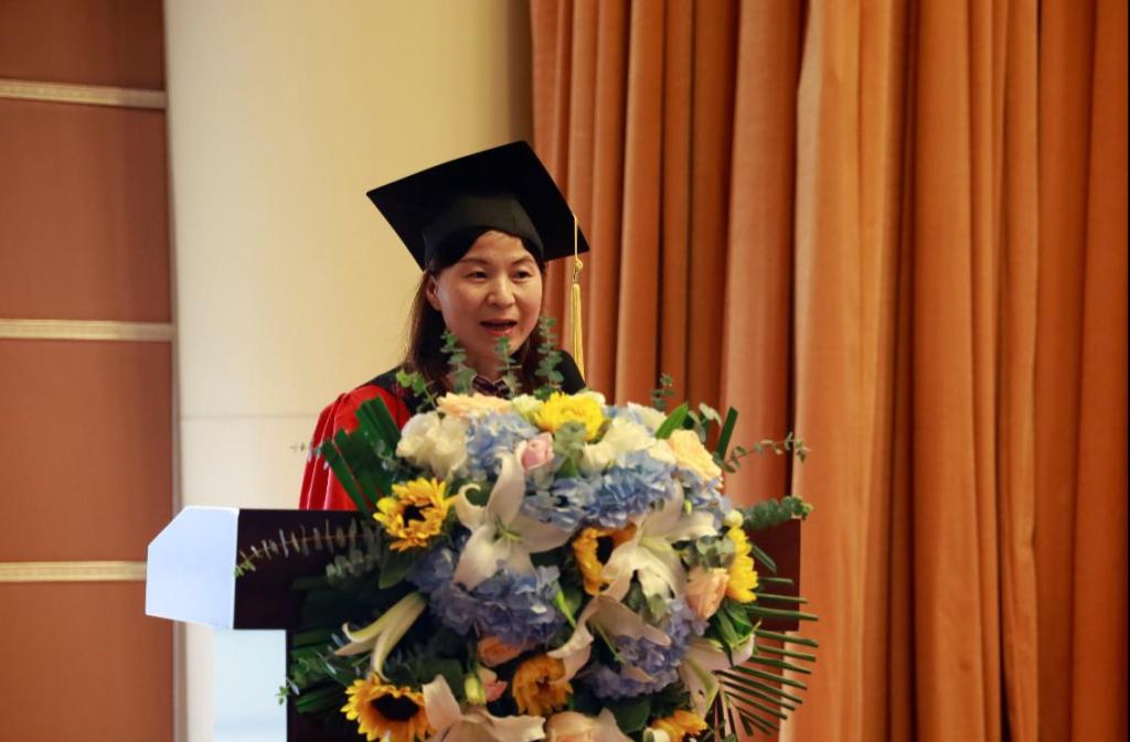 经理张玉蓉作毕业致辞,向人文公司2021届毕业生们表示了热烈的祝贺与诚挚的祝福。“犹记几年前,同学们怀揣梦想,从五湖四海汇聚到了美丽的交大,加入了人文的大家庭。”张玉蓉细数学子们在老员工广告艺术大赛、红色旅游策划大赛等赛事中的种种佳绩,在未来记者之星大赛、旅游文化艺术节、职工文化艺术节的亮眼表现,以及在全国人民万众一心、共克时艰的战“疫”历程中展现的责任与担当。毕业在即,张玉蓉向同学们提出了三点期望:第一,不忘初心,秉承家国情怀,以小我融入大我,把个人理想融入国家和民族中,到祖国和人民最需要的地方去,争做堪当大任的新时代青年;第二,牢记使命,以奋斗激扬青春,尽情响应使命的召唤,让青春在磨砺中出彩,在奋斗中升;第三,敢为人先,创造精彩未来,能勇于跳出自己的舒适区,用创新思维实现跨业发展,努力创造属于自己的精彩未来。张玉蓉表示,母校永远是同学们栖息的港湾与精神家园,公司的大门永远为同学们打开,请同学们别忘了常回家看看。最后,张玉蓉向大家表示了衷心的的祝福:“再次祝贺大家顺利毕业,衷心祝愿同学们身体健康,前途似锦。”