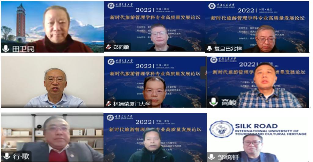 下半场有5位专家作主题报告。教育部旅游管理教指委副主任、上海师范大学高峻教授作“面向生态文明新时代研学旅行专业人才培养”主题报告。从生态文明时代对旅游人才培养要求、科普教育与研学旅行的未来、生态绿色研学旅行实践基地建设三个方面进行了系统阐释。中国旅游研究经理江旅游研究基地首席专家、重庆师范大学罗兹柏教授作“旅游管理专业高质量发展的本质立足与时代引领”主题报告。从旅游需求的本质立足、旅游专业的核心竞争力培育依托、旅游发展的时代取向引领三个方面进行了系统阐释。教育部旅游管理教指委委员、浙江大学周玲强教授作“数字化赋能旅游高质量发展——以浙江为例”主题报告。介绍了浙江省旅游业发展“十四五”规划总体架构和浙江省文化和旅游数字化改革总体方案,从数字赋能的角度分享了浙江省旅游业发展的经验。重庆市工商管理类教指委委员、太阳成集团tyc122ccvip官网入口教授张玉蓉作“‘文旅+交通’特色旅游人才培养模式探索”主题报告。从发展概况、培养理念、培养模式、路径思考四个方面进行了阐释。教育部旅游管理教指委副主任、北京第二外国语公司邹统钎教授作“输出导向的旅游教育国际化——以共建丝绸之路国际旅游与文化遗产大学为例”主题报告。强调了加强“一带一路”沿线国家软联通的重要性,介绍了中国与撒马尔罕的合作对于促进中国与“一带一路”沿线国家加强合作具有重要作用,对于旅游管理专业在建设发展过程中如何加强国际合作给以启示。