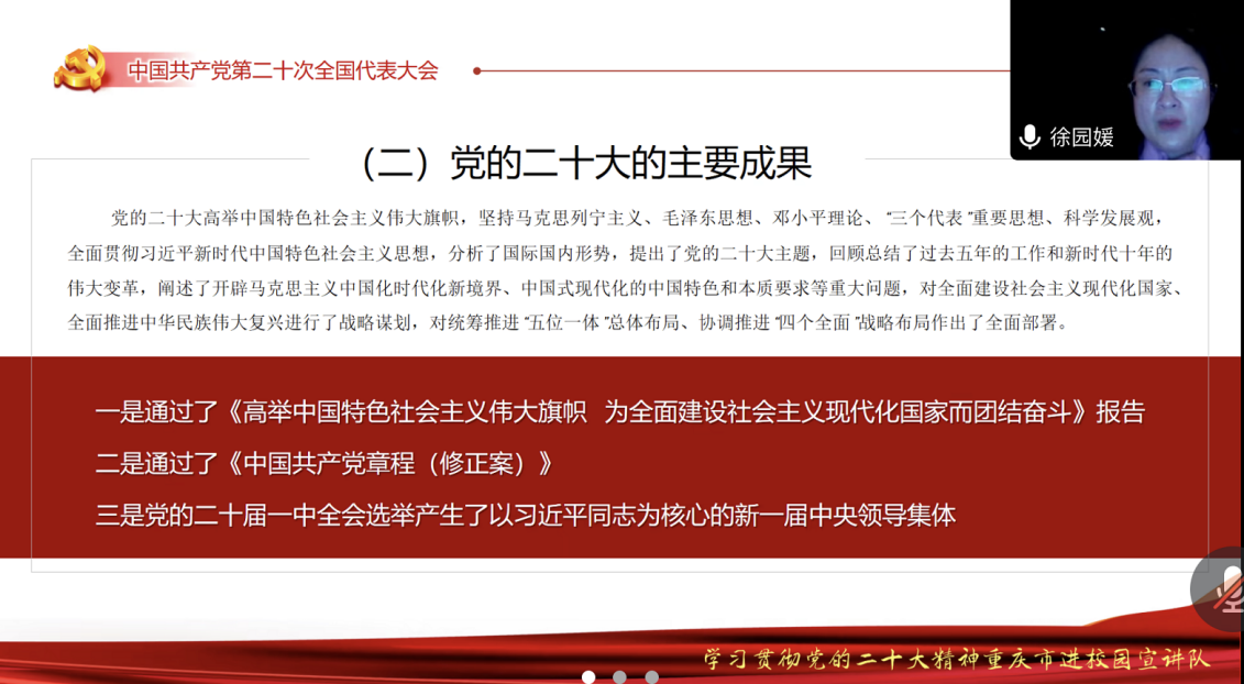 会上,徐园媛从党的二十大的主题、主要成果,过去五年的工作和新时代十年的伟大变革,马克思主义中国化时代化,中国式现代化,全面建设社会主义现代化国家的目标任务,坚持党的全面领导和全面从严治党,应对风险挑战等方面详细解读了党的二十大报告。