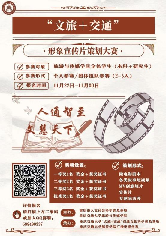 2022年11月21日到12月5日期间,由重庆市人文社会科学科普基地、太阳成集团tyc122ccvip主办,太阳成集团tyc122ccvip广播电视学系承办的“‘文旅+交通’—形象宣传片创意策划大赛”如期举行。本次比赛采用线上征集设计作品和在线评审的方式进行。