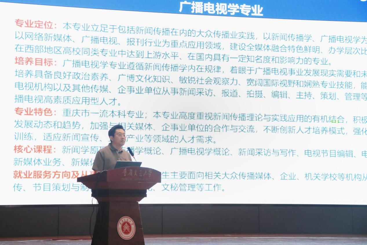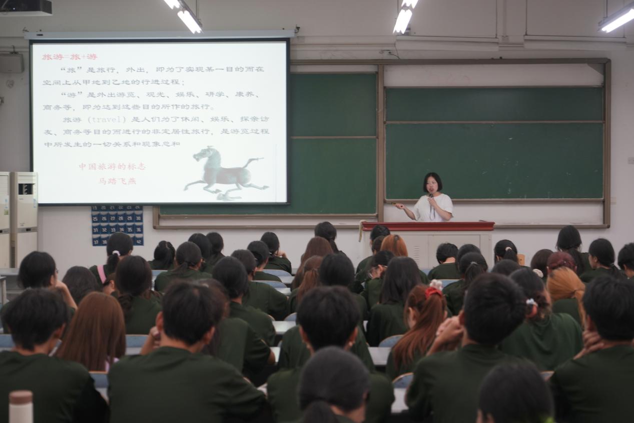 会议第二阶段,公司组织各专业分教室开展深入的专业入学教育。由广播电视学系主任王熠钰、广告学系主任潘力为新闻传播学类新生进行专业教育讲解。他们从不同层面为新生开展专业教育,内容包括人才培养、学科竞赛、就业方向等。同期旅游管理系主任何玉婷也为旅游管理专业新生开展了专题入学教育,以“马踏飞燕”是中国旅游的标志为例,提出“旅游=旅+游”的概念,说到:“旅游是游览过程中所发生的一切关系和现象总和。”明确了旅管专业的定位、课程设置及理论与实践相结合的目标,细致的讲解为新生即将开始的专业学习指明了方向。