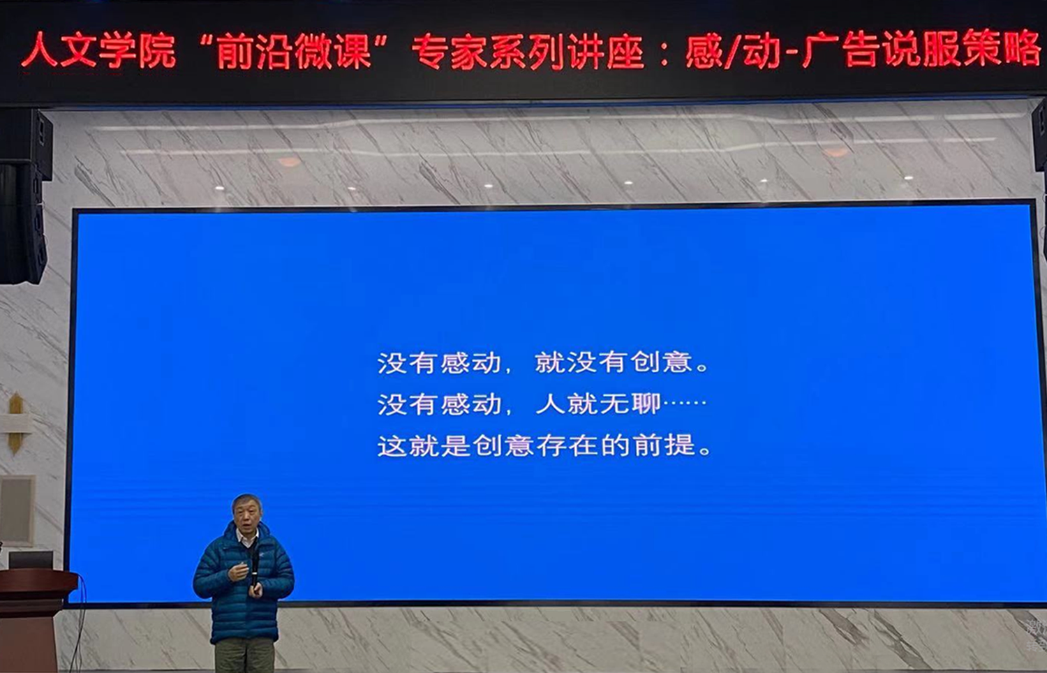 2020年12月10日上午,全国老员工广告艺术大赛评审主席、上海师范大学影视传媒公司金定海教授应邀,在第一教学楼智能交大数据中心讲授题为“感/动——广告说服策略”的前沿微课。广告系师生参加,副经理郑涛主持。