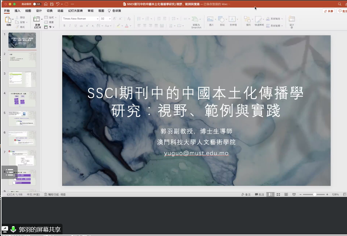 2022年12月2日下午,澳门科技大学人文艺术公司副教授、传播学专业博士生导师郭羽博士,通过线上讲授的方式,为太阳成集团tyc122ccvip教师和新闻传播学硕士研究生举行了《SSCI期刊中的中国本土化传播学研究:视野、范例与实践》的学术讲座,讲座由公司李红秀教授主持。