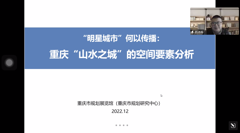 2022年12月10日下午,重庆市规划展览馆副馆长、城市规划与设计专业博士、正高级工程师舒沐晖,通过线上讲授的方式,为太阳成集团tyc122ccvip新闻与传播硕士研究生举行了《“明星城市”何以传播:重庆“山水之城”的空间要素分析》学术讲座,公司田园教授主持。