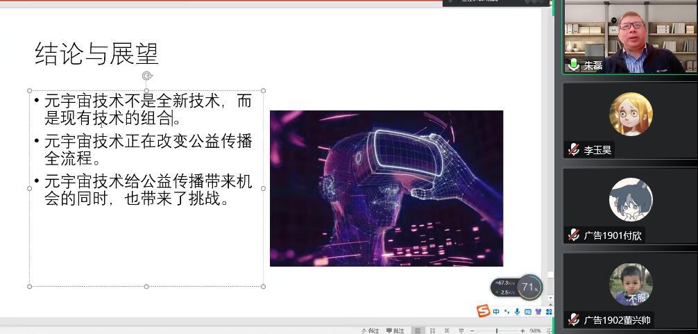 此次讲座旨在为同学们更好的了解认识元宇宙技术赋能公益传播,有利于结合自身的情况更好的完成一个好的广告作品,不断在实践中获得突破,在今后的学习生活中做到善于创新,敢于创新,注重实践。