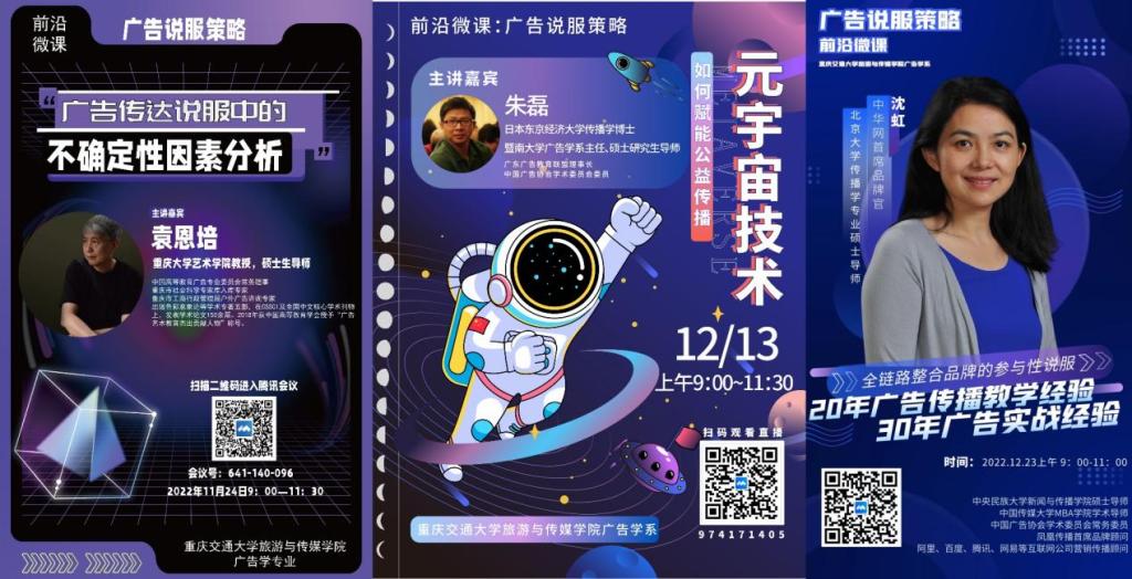 大学袁恩培教授、暨南大学广告学系朱磊主任、北京大学传播学专业硕士导师沈虹博士为广告学专业的同学开设了“广告说服策略”前沿微课,分别于12月9日、12月13日和12月23日在线上会议进行,广告学系主任潘力主持。