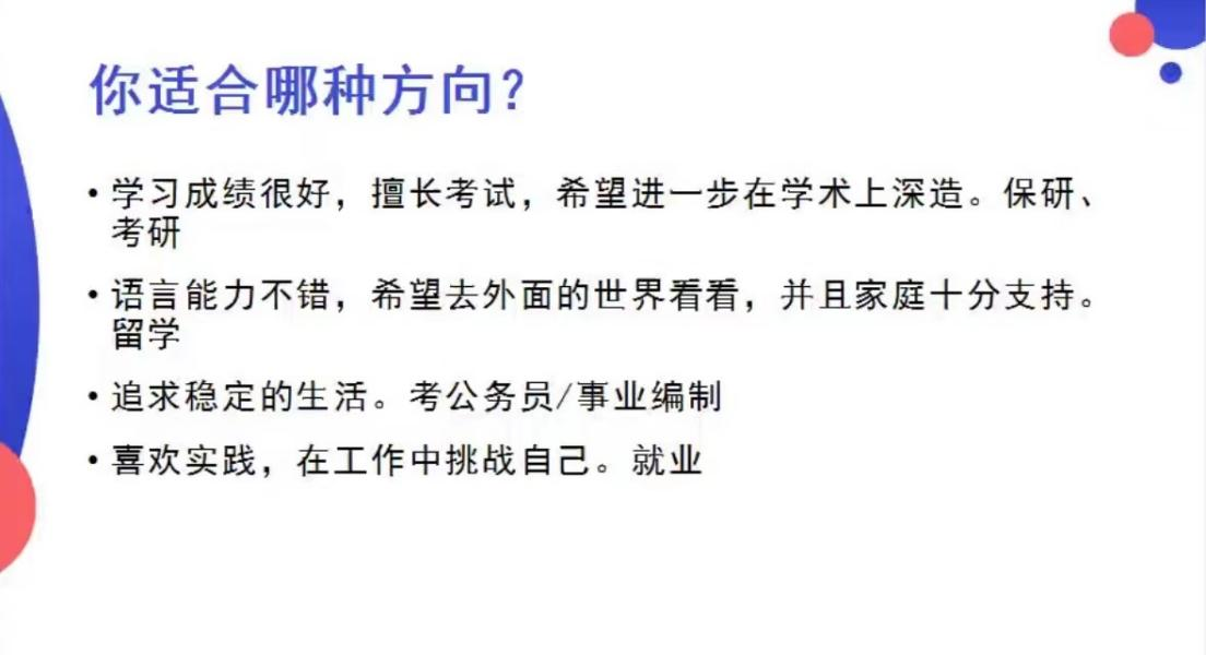在关于未来方向选择的问题上,方诚博士提出要根据同学们自身的性格特质选择,提前做好规划。希望大家对于自身发展不要设限,发掘更多的潜力。为了让同学们对于未来有一个更加清晰的认识,方诚博士还带来四位学长学姐的案例,通过学长学姐的真实故事让大家充分了解到“选择”与“规划”的重要性以及具体步骤。