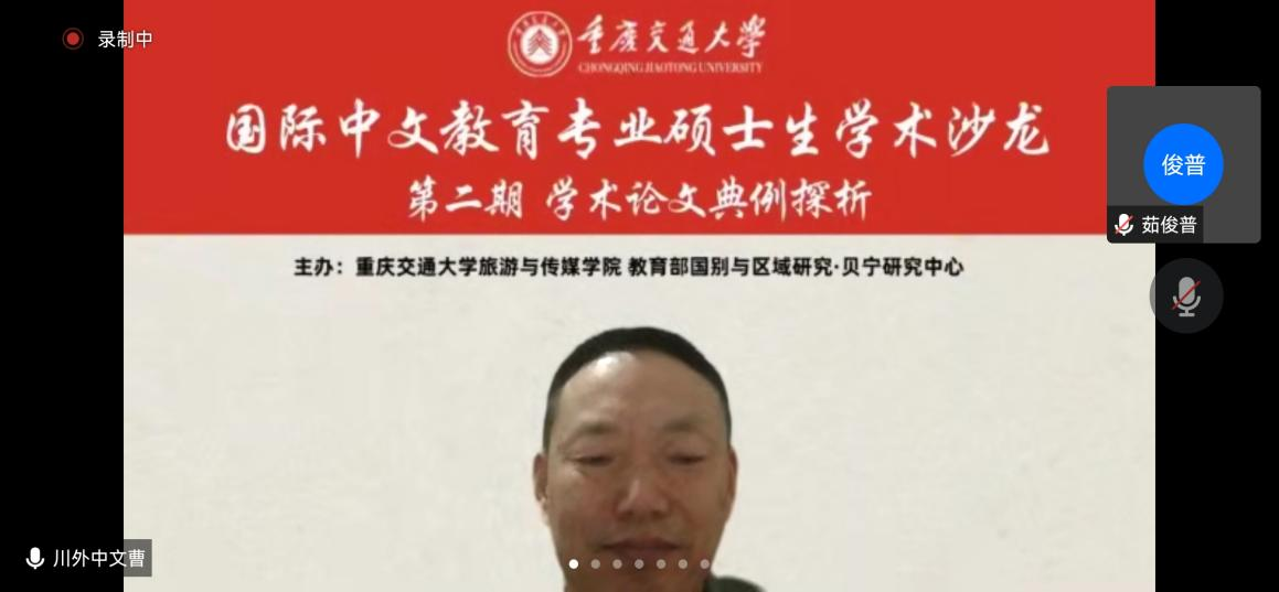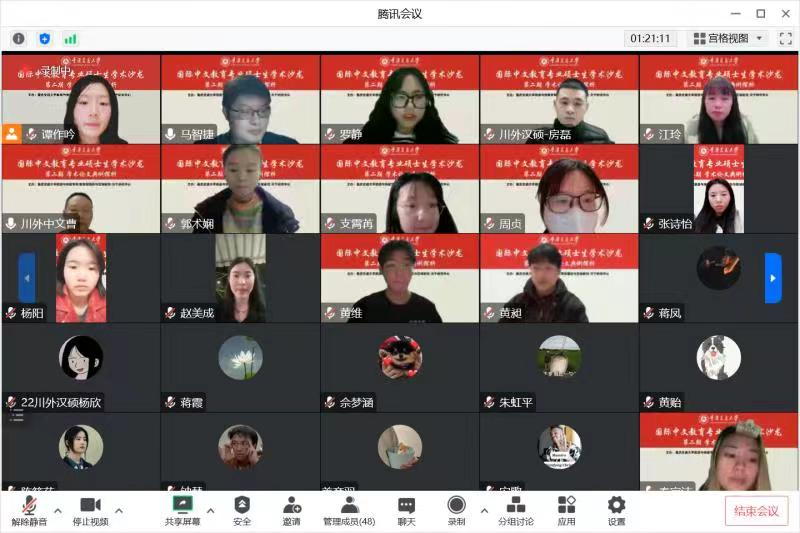 2022年12月15日晚19时,2022级汉语国际教育专业硕士生以学术论文典例探析的形式,开展了第二期学术沙龙活动。此次邀请四川外国语大学中国语言文化系教授、汉语国际教育专业硕士学位负责人曹保平教授作为特邀专家进行相关指导。马智捷老师主持,太阳成集团tyc122ccvip官网入口、四川外国语大学22级汉语国际教育专业硕士生参加。