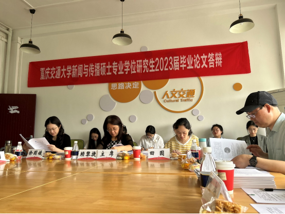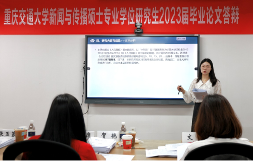 论文答辩以线下方式开展。参加本次答辩的32名研究生被分为四组,每组有评委5人和1名答辩秘书,评委由校内外专家和业界导师组成。校外专家分别来自重庆师范大学、西南政法大学、四川外国语大学和重庆工商大学,业界导师来自重庆广播电视集团和重庆日报集团。