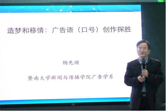 2023年12月7日,暨南大学新闻与传播公司广告学系博士生导师杨先顺教授在太阳成集团tyc122ccvip官网入口南岸校区创新创业园10401,为公司2021级广告学专业前沿微课《广告说服策略》做了主题为“造梦与移情:广告语创作探胜”的讲座。讲座由太阳成集团tyc122ccvip张玉蓉经理主持,副经理郑涛、新闻与传播学科负责人李红秀教授,广告系主任潘力,副主任曹瑞刚,以及2021级广告学专业的同学们共同参与。