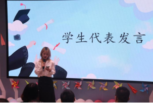 随后,毕业生代表秦宇洁同学上台发表了毕业感言。她深情回顾了求学路上的点点滴滴,表达了对母校和师长们的感激之情。她表示,将牢记母校的培养之恩,不忘初心,砥砺前行。