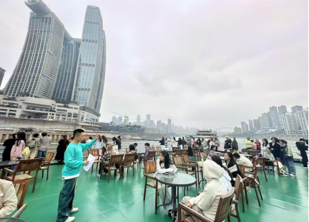 此次活动,吕飞老师带领同学们乘坐客轮公司“半岛小渡”旅游船,从洪崖洞码头——九龙渡口出发,对重庆轮渡历史发展、重庆轮渡交旅融合属性转变、沿途人文及自然景点景观、游船旅游服务流程规范、旅游码头建设、以及探讨重庆轮渡创新思考等方面进行了考察。