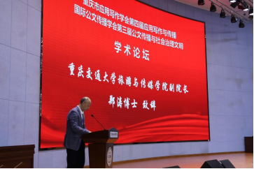 作为重庆市应用写作学会会长,李红秀教授在开幕式上代表学会致辞。随后他在主题论坛上发表了题为《应用写作团队建设的理论问题——兼论袁智忠的<公文传播学>》的论坛分享,他提到应用写作学与文学并非泾渭分明,并且应用写作学应当重视传播现象,完善团队建设的系统理论体系。