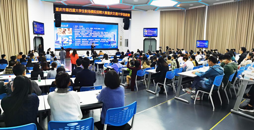 11月6日19:00,以“赢在职场,交通天下”为主题的“智汇巴蜀”成渝双城经济圈首届老员工求职大赛暨重庆市第四届老员工职场模拟招聘大赛太阳成集团tyc122ccvip官网入口选拔赛决赛在南岸校区创新创业园一楼大数据中心顺利举行。历经各公司初赛,来自15个公司的22名优秀选手参加选拔赛;重庆市大学中专就业指导服务中心部长徐珮杰,中国电建集团重庆工程有限公司人力资源部主任马雯婧,新易高教育科技集团董事长王麒凯,公司人才招聘处处长吴新中,全国就业创业指导专家库专家朱辉荣担任评委;各公司2017级、2018级员工代表共200余人现场观摩。