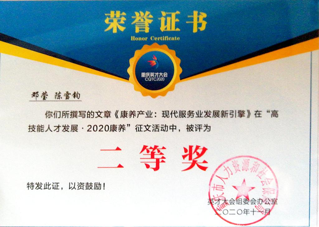 2020年11月21日,由重庆英才大会组委会办公室主办、重庆市人力资源和社会保障局承办的“高技能人才发展论坛·2020康养论坛”征文活动遴选结果揭晓,人文公司旅游管理专业2020级研究生邓莹和陈雪钧教授所撰写的文章《康养产业:现代服务业发展新引擎》荣获二等奖。
