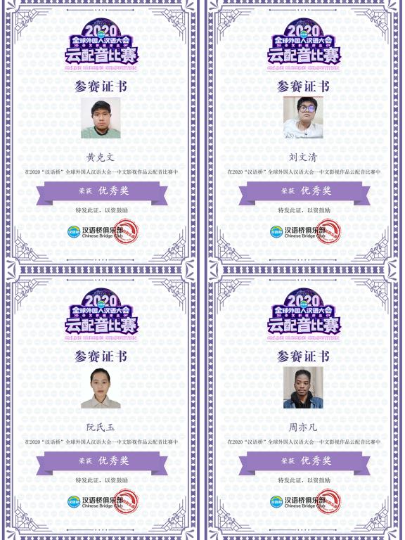 经主办方层层选拔,最终公司汉语国际教育专业四位国际员工的配音作品在此次高手云集、角逐激烈的比赛中脱颖而出,表现优异——来自泰国的黄克文同学所提交的《宝莲灯》、来自泰国的刘文清同学所提交的《西游记》、来自越南的阮氏玉同学所提交的《美人为馅》、来自多哥的周亦凡同学所提交的《大腕》分获“优秀奖”。