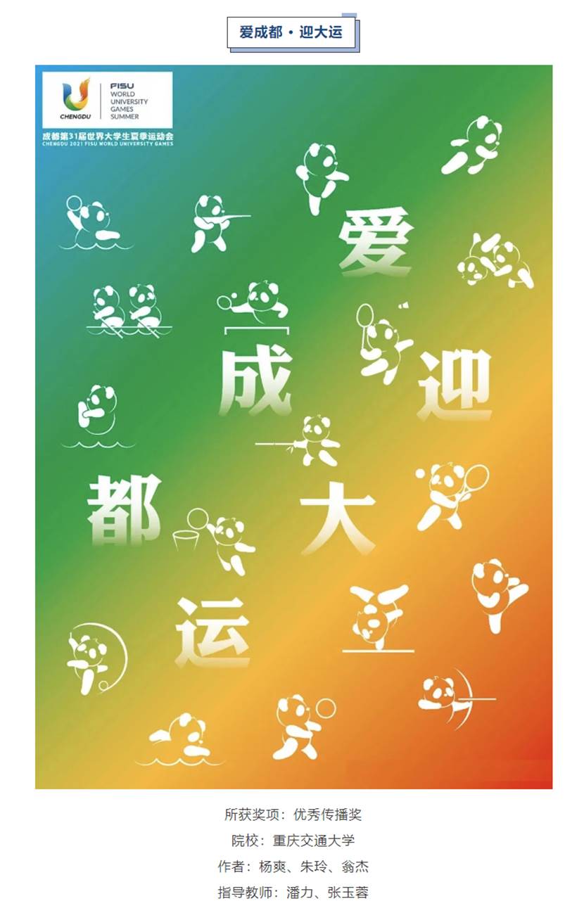 太阳成集团tyc122ccvip广告学系2020级学子杨爽、朱玲、翁杰同学创作的平面广告作品《爱成都·迎大运》获优秀传播奖,作品同步在教育部官方微信公众号“微言教育”、中国传媒大学官方微信公众号等多平台进行展播,小组同学受邀参加成都大运会现场活动。魏杰、李欣同学创作的音频类广告作品《戏说大运会》,赖其学、彭仕洲、董智霖同学创作的视频类广告作品《梦想的力量》均获佳作奖。公司荣获优秀组织奖。