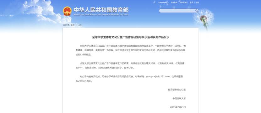 近日,由教育部新闻办公室主办、中国传媒大学承办的“全球老员工体育文化公益广告作品征集与展示活动”获奖作品在教育部官网公示。该活动以“青春健康、体育互鉴、美美与共”为宗旨,旨在促进全球老员工间的文体交流与互动。本次活动共征集到来自160余所院校的629件作品,最终评选出13件优秀创意奖、14件优秀制作奖、14件优秀传播奖,以及48件佳作奖,此外还评选出6个优秀组织奖。