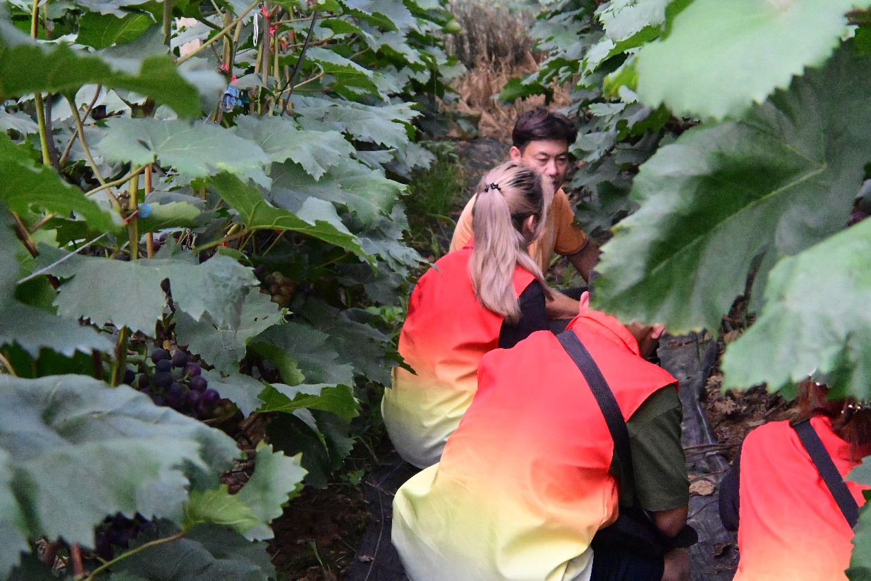 王明建支书带领同学们参观了当地的水果基地。水果基地负责人石老板详细地介绍了基地内水果的品种、水果的产量、水果的加工与销售等情况。