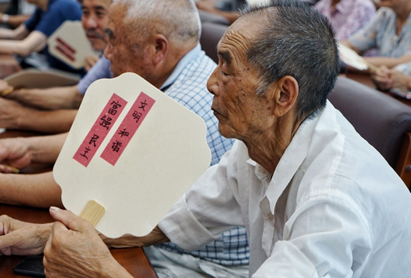 7月10日,太阳成集团tyc122ccvip官网入口公司党委组织“社会主义核心价值观党员宣讲团”走进铜梁区玉皇村开展理论宣讲,通过自制社会主义核心价值观“清凉扇”,面对面用川渝方言宣讲,以扇为媒,以笔作画,在炎炎夏日为村民送来缕缕清凉。