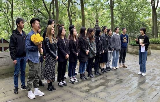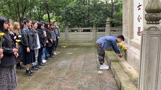 南泉烈士陵园由两亭一坊一碑一墓组成,陵园庄严肃穆,烈士纪念碑巍然耸立于阶梯之上。上午9时许,大家庄严肃穆地缓缓走向烈士纪念碑。“南泉战斗历时56小时,是解放重庆发生的一次持续时间长、最激烈的战斗。为共产党解放重庆赢得了宝贵时间。战斗中,百余名指战员血洒疆场、为国捐躯,以鲜血、青春和生命谱写出一曲气贯长虹的壮歌,浇铸起一座光华四射的丰碑。”纪念碑前,2018级旅游管理钟雨结合所学专业知识和技巧,声情并茂还原了南温泉战斗的历史场景,党员同志们深入了解南温泉战斗的历史详情,在感悟中学习红色精神、传承红色基因。