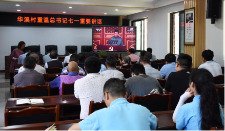 上午九点,实践团全体队员在中益乡政府和华溪村的老党员同志们一起开展党史学习主题教育活动,重温习近平总书记在“7·1”庆祝中国共产党建党100周年大会上发表的重要讲话。村支部书记王祥生表达了到北京天安门广场参加盛会的激动振奋的心情,并与在座的各位党员同志、实践团成员分享大会在北京天安门广场受邀参加大会时的所见所闻、所感所想。