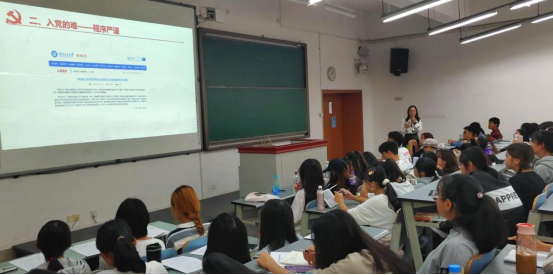 肖丽群阐述了入党启蒙教育的目的,以及在老员工共青团员群体里早引导、早教育的重要意义。接着,肖老师围绕“大学期间入党的难”讲解了老员工入党条件、流程以及党内相关规章制度;结合张桂梅等优秀共产党员的事迹,围绕“大学期间入党的易”引导新生们要端正入党动机,坚守初心,目的纯粹,全心全意为人民服务。肖老师多次提及大学期间入党既难又易。对于入党动机不端正,跟风入党、虚荣入党的同学来说难;对入党动机端正,有坚定理想信念,在各方面争做先锋模范的同学来说易。