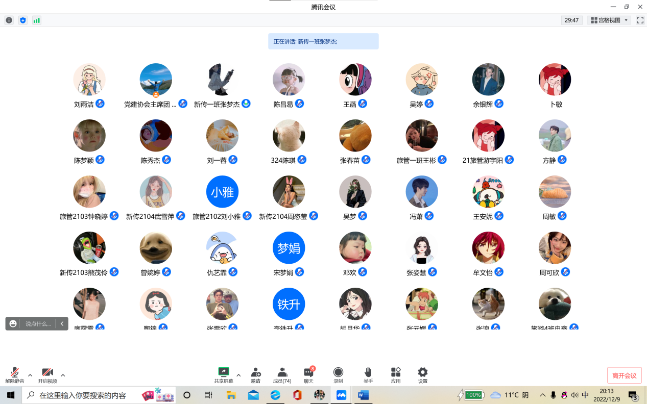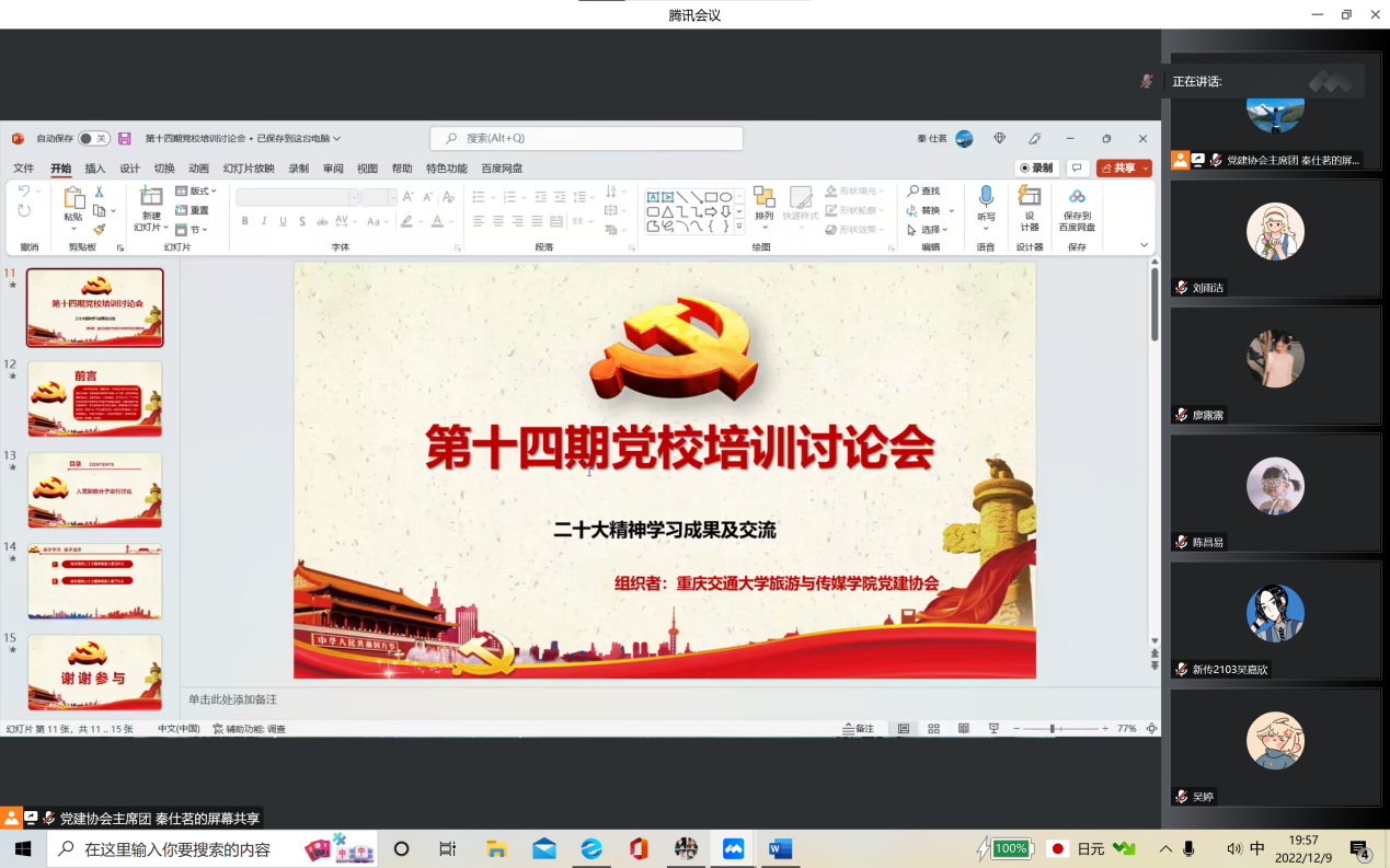 12月9日,党务干事刘幸组织分党校培训第八课时:专题讨论。参与培训的入党积极分子围绕“结合党的二十大精神,谈谈入党为什么,为党干什么”这一主题头脑风暴,讨论期间,同学们积极参与、主动发言,展示了同学们新时代矢志不渝的入党决心和坚定不移的信念。