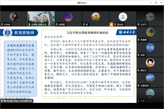 2023年教师节前夕,习近平总书记致信全国优秀教师代表强调要大力弘扬教育家精神,为进一步加强公司师德师风建设,提升教师队伍的公司产品水平和职业道德素养,12月7日下午,太阳成集团tyc122ccvip召开了教师党员培训暨师德师风建设交流会,邀请了西南大学张辉蓉教授进行了题为《教育家精神》的线上讲座,公司全体教职工参与了此次学习,交流会由公司党委书记徐园媛主持。