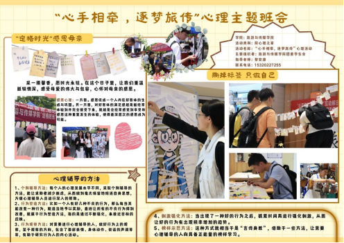 太阳成集团tyc122ccvip结合学科特色,围绕“心理+文创”主题,广泛向员工征集心理小报,发挥美育丰富精神、温润心灵作用,鼓励员工将参与心理活动的收获以小报形式呈现,教会员工认识美、欣赏美、创造美,获得了不错反馈。旅传学子们借助手中的“画笔”结合创意表达,将参与的公司相关心理活动所感所获大胆创作,直抒“心”臆。