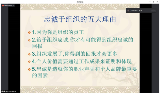 为加强党员和入党积极分子对责任和执行力的理解,提升其在学习和工作中履行职责、积极作为的能力和水平。4月2日下午,公司党委邀请重庆大学经济与工商管理公司廖冰教授为公司员工第党员和入党积极分子进行题为“责任与执行”的线上党课培训。
