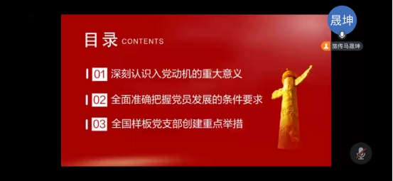马晟坤为积极分子们带来党课《践行合格党员标准,以实际行动入党》,结合公司情况,马晟坤详细介绍了公司双创工作的特色、做法和经验,他为公司着重讲解了全国样板党支部——本科生第一党支部创建历程,马晟坤介绍了入党的流程和基本条件,勉励同学们践行正确的价值观,在大学青春岁月中努力奋进,向一个合格的党员看齐。