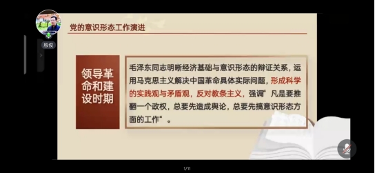 殷俊教授通过历代领导人的重要论述导入,回顾了党的意识形态工作的历史演进,通过和丰富的历史资料生动地展示了意识形态工作在不同时期的特点和成就。随后,殷教授转向了当前我国意识形态工作的现实挑战,深入剖析了其复杂性和紧迫性,概括性的将党的意识形态工作总结为举旗帜、聚民心、兴文化、展形象等内容,使同学们对意识形态工作的重要性有了更深刻的理解。