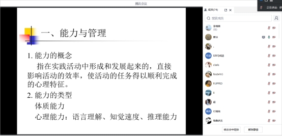 廖冰教授以幽默风趣的语言从心理学的角度分析能力、智力与管理能力的培养塑造。他用老总酒驾的两种解决方式、盲人买剪子的事例生动形象地为同学们展现创新思维在日常生活中的实践应用。同学们通过评论区与廖冰教授积极互动,回答问题、提出自我见解。