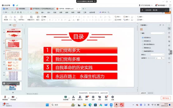 航空公司韩正清老师讲授了自我革命永葆生机活力,核心点:我们党有多大,我们党有多难,包含中国共产党第一次全国代表大会和自我革命的历史实践。
