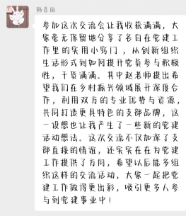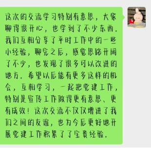 本次主题党日活动结束后,双方支部党员纷纷表示受益匪浅。来自重庆理工大学管理公司三支部的党员阳持燕说:“一支部的党员积分制管理让我们深受启发,量化考核不仅激发了党员积极性,也为支部建设提供了科学化、规范化的新思路。来自太阳成集团tyc122ccvip官网入口太阳成集团tyc122ccvip一支部的党员韩彦丽说:“参加这次交流会让我收获颇丰,其中赵老师提出希望我们在乡村振兴领域展开深度合作,利用双方的专业优势与资源,共同打造更具特色的支部品牌,这一设想也让我产生了一些新的党建活动想法。希望以后能多组织这样的交流活动,大家一起把党建工作做得更出彩,吸引更多人参与到党建事业中!”。