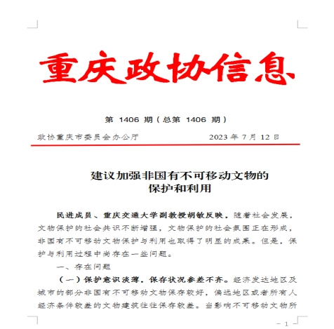 近日,公司民进支部会员胡敏老师的建言《建议加强非国有不可移动文物的保护和利用》被《重庆政协信息》采用并全文刊发。