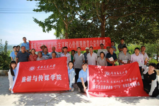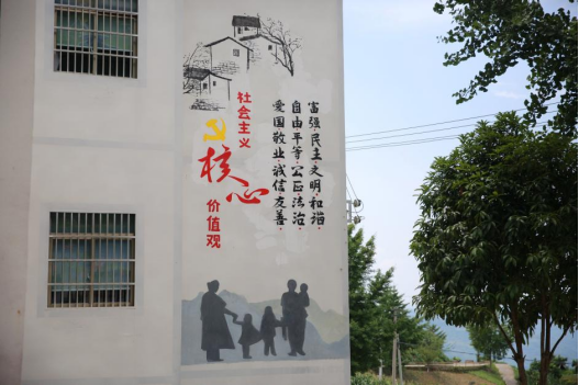 泉水村便民服务中心旁有这样一面乡村手绘文化墙,将24字的社会主义核心价值观送到村民们眼前。这面墙便是泉水村弘扬社会核心价值观的户外教学“屏幕”,它让大家在潜移默化中了解并认同社会主义核心价值观。与24字相配的是幸福的一家五口以及优美的人居环境壁画,这使人们能够更好地体悟社会主义核心价值观给人们生活带来的美好。“但仅仅有潜移默化的影响还不够,我们应当携手泉水村人民共同践行社会主义核心价值观,这是我们三下乡社会实践服务团的的责任和使命。”于是,一场别开生面的社会主义核心价值观宣讲活动就此展开,通过“小话题”阐释“大道理”、运用“百姓话”讲述“家国事”、借助“微宣讲”唱响“好声音”。