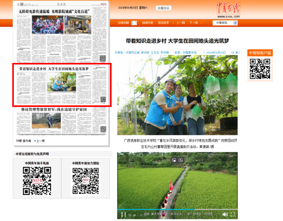 日前,广西信息职业技术公司员工韦弈轩和同学们深入广西桂林乡村,以乡村发展成就为现实教材,开展社会实践。在他们看来,这正是践行总书记“厚植爱农情怀,练就兴农本领,在乡村振兴的大舞台上建功立业”的殷殷嘱托。