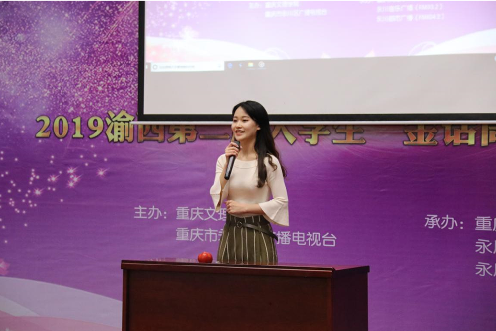 4月13日,渝西第二届“金话筒”主持人大赛复赛在重庆文理公司隆重举行,人文公司16级广播电视学专业员工高小单、17级新闻传播类员工张婧在陈芊芊老师的带领下赴重庆文理公司参赛。
