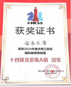 近日,在重庆市象棋协会主办、重庆两江新区国际象棋协会承办的2024年国际象棋等级赛中,24级汉语国际教育专业蒙古籍本科生孟和尔登(Turkhuu Munkh-Erdene)凭借出色的棋艺和坚韧不拔的精神,力压群雄,荣获十四级及定级A组冠军,为公司赢得荣誉。