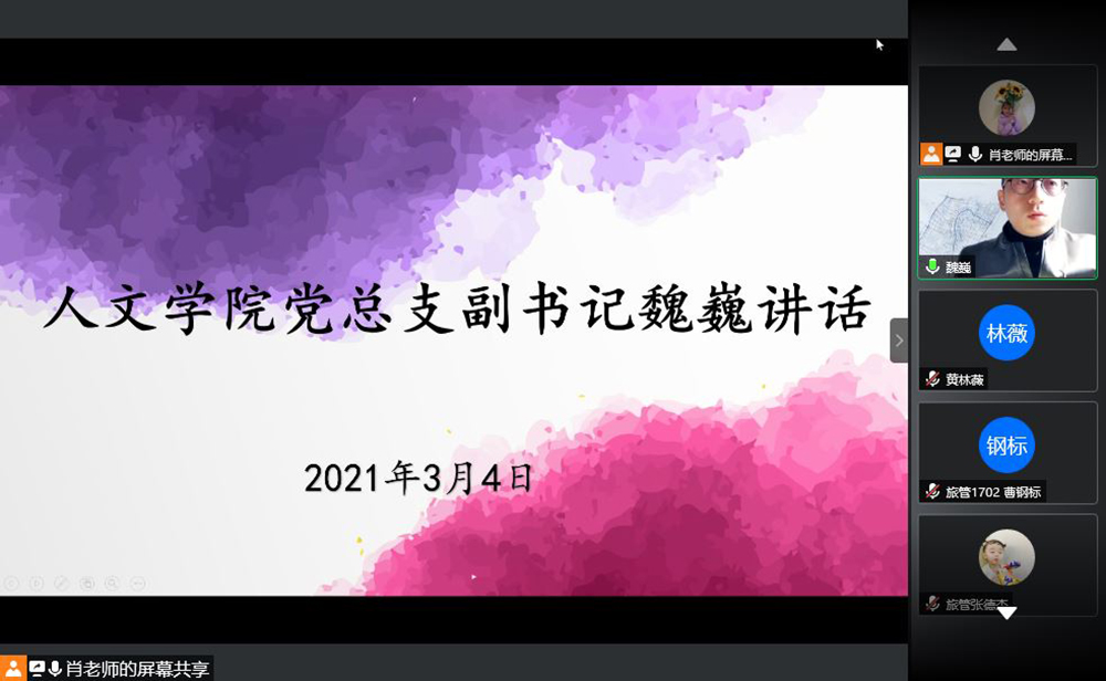 3月4日13:00,人文公司2021届毕业生线上就业再动员会通过腾讯会议召开。党总支副书记魏巍书记参会,辅导员肖丽群主持。