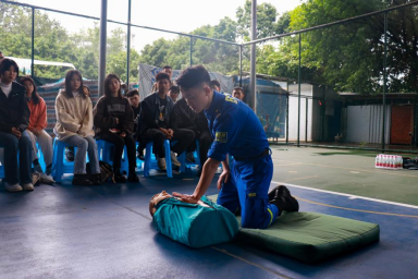 “1001、1002、1003……先生,先生,您刚刚晕倒了,我将陪同您等待救护车的到来。”围坐一团的师生聚精会神地观看讲解员岳淇民的演示,心肺复苏法、灭火器的使用方法……种种急救方法在他绘声绘色的讲解中变得生动有趣、简单易懂。