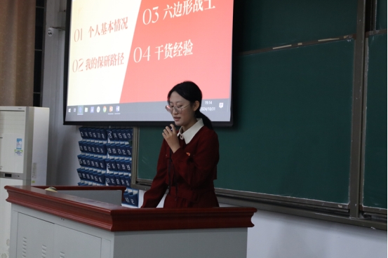 “走一步算一步,但你走的每一步都算数”,张鑫通过分享自己的学习经验以及获奖经历,告诉同学们她是如何从完全不想考研到成功推免的。“选择大于努力”,共获得18个奖项的她,向同学们分享了自己的获奖秘籍。除此之外,她鼓励同学们充分利用网络学习资源,并做好学习资料的整理分类,为同学们的学习之路指明了方向。