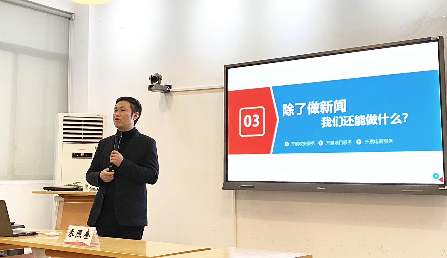 另讯 12月29日16:00至18:00,潼南区传媒集团党委书记米照奎为研究生作了《三创新推进媒体供给侧改革》的专题讲座,围绕“潼南融媒体,我们是什么样子?”“全媒体时代,我们如何跟节奏?”“除了做新闻,我们还能做什么?”三个内容,全方位展现了潼南区融媒体中心新旧媒体立体化融合的图景,从组织改革、组织构架、运行体制、人才培养、薪酬体系五个方面进行了详细介绍。米照奎指出,要跟上当前融媒体时代发展的节奏,需要加大专业人才培养力度,从转型升级、培训学习、考核导向三个方面打造孵化全媒体人才队伍,积极促进爆款全媒体产品的生产,以人民为中心开展好政务服务,打造便民服务的窗口。